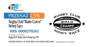 Przekaż 1,5% swojego podatku na Rugby Club Biało-Czarni Nowy Sącz i dorzuć swoją cegiełkę do tego, co budujemy razem. Dla Ciebie nie jest to koszt, a dla nas ogromne wsparcie;